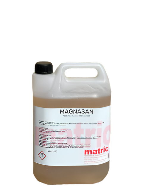 Food Area Cleaner and Sanitiser - Magnasan is suitable for cleaning and sanitising floors, walls, benches, shelves, refrigerators, canteen and bakery equipment, bathrooms and showers. For sinks, drains and lavatories. An excellent germicidal dishwashing liquid. An effective algaecide. Tests show that 1 oz per gallon of water at a temperature of 48°c is effective against Escherichia coli, Staphylococcus Aureus, Salmonella Typhimurium, Pseudo Monas Aeriginosa