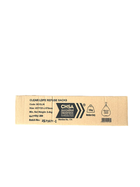 Clear Bags are CHSA approved. Designed for general household and industrial waste. Made from 100% recycled polythene. 18/29 x 39" approx. Also available in size 36x56” – 500g