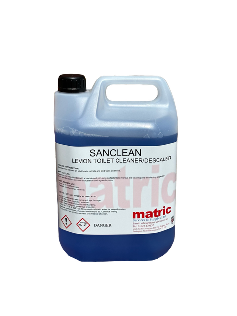 Lemon Toilet Cleaner/Descaler - May be used on toilet bowls, urinals and tiled walls and floors. Sanclean has been blended with a biocide and non-ionic surfactants to improve the cleaning and disinfecting properties. It will also deodorise and removes encrustation and algae deposits. Toilet brushes also available.