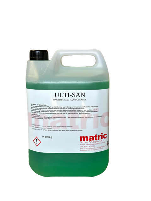 Bactericidal Hand Cleaner - Ulti-san is a blend of powerful, yet gentle cleaning agent designed for use as an effective hand cleaner. Free from organic solvents and can be used in hard or soft water areas. This product is pleasantly perfumed and contains a germicide to help kill germs and heal minor cuts. Ulti-san Bacterial Hand Soap is ideal for use in hospitals and kitchens and any food preparation areas to prevent cross contamination allowing you and staff to maintain a high level of hygiene.